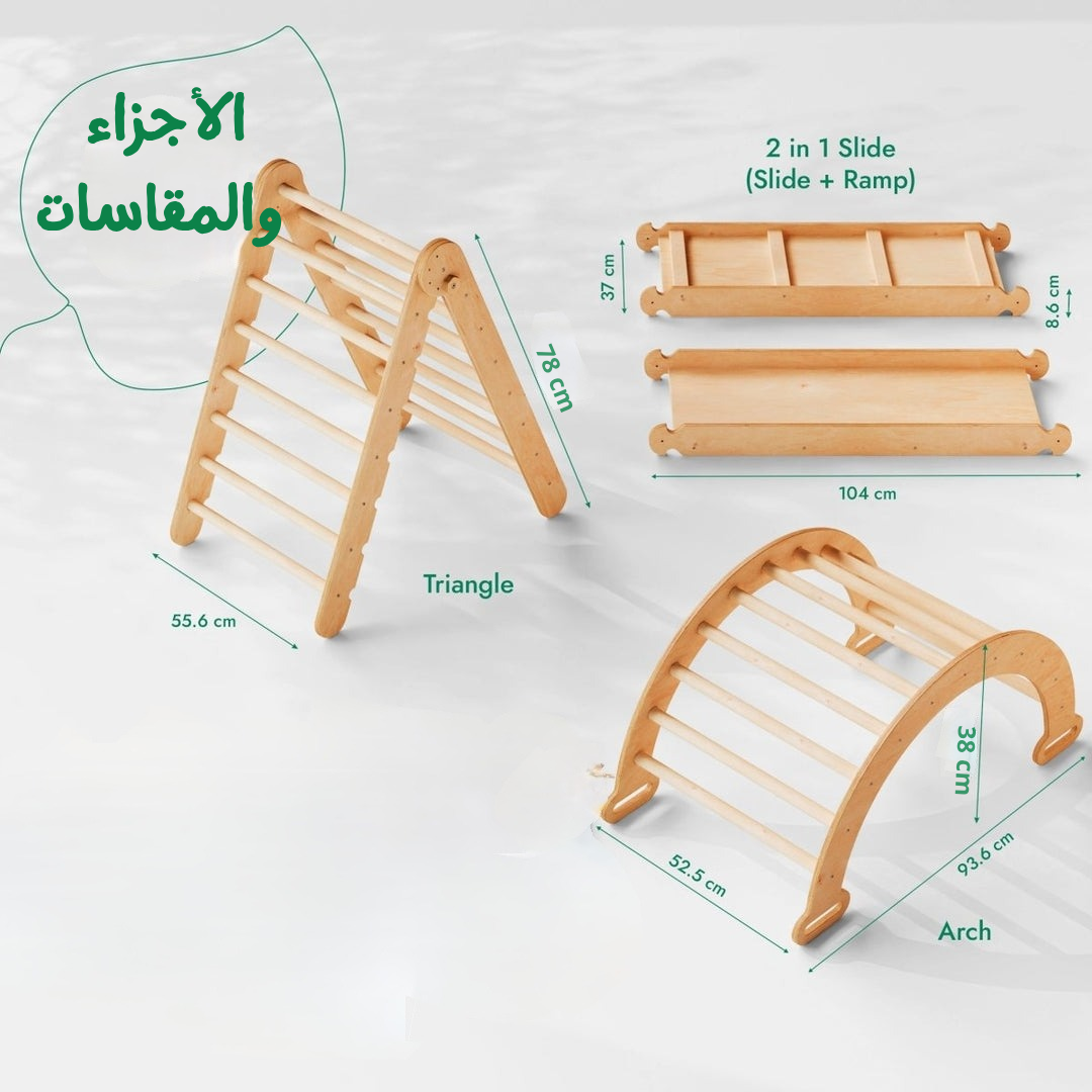 مجموعة تسلّق مونتيسوري 3 في 1: سلم مثلث + قوس للتسلق + لوح منزلق(خشب طبيعي 100%)